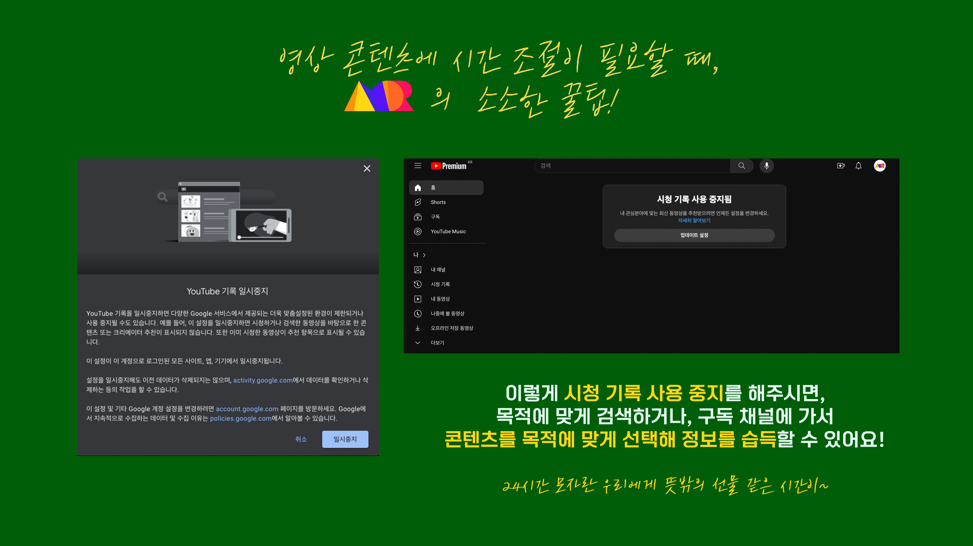 바로! 유튜브 기록을 중단 시켜 추천 영상이 뜨지 않게 하는 것입니다!