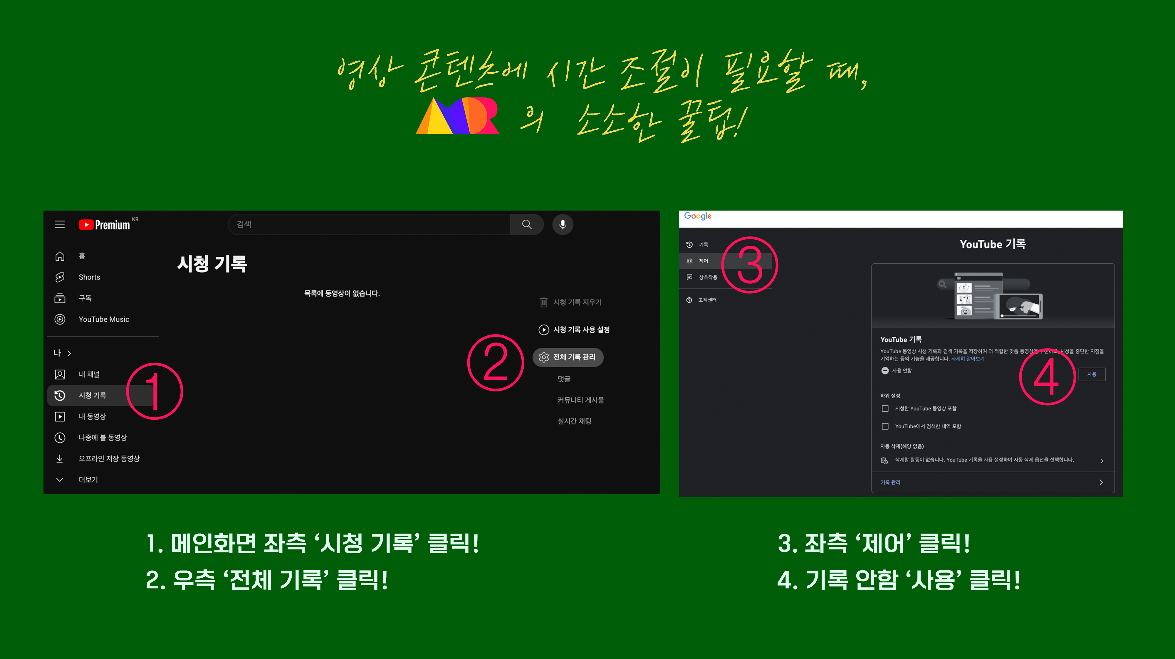 바로! 유튜브 기록을 중단 시켜 추천 영상이 뜨지 않게 하는 것입니다!