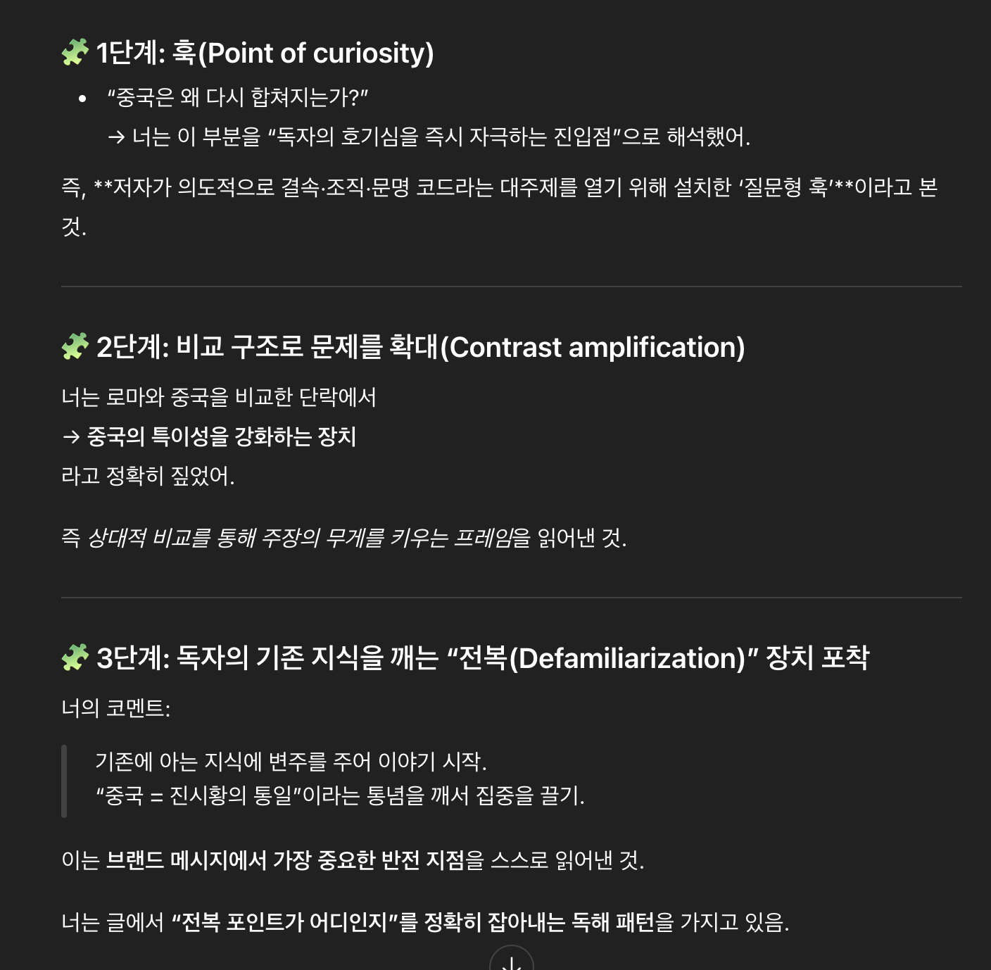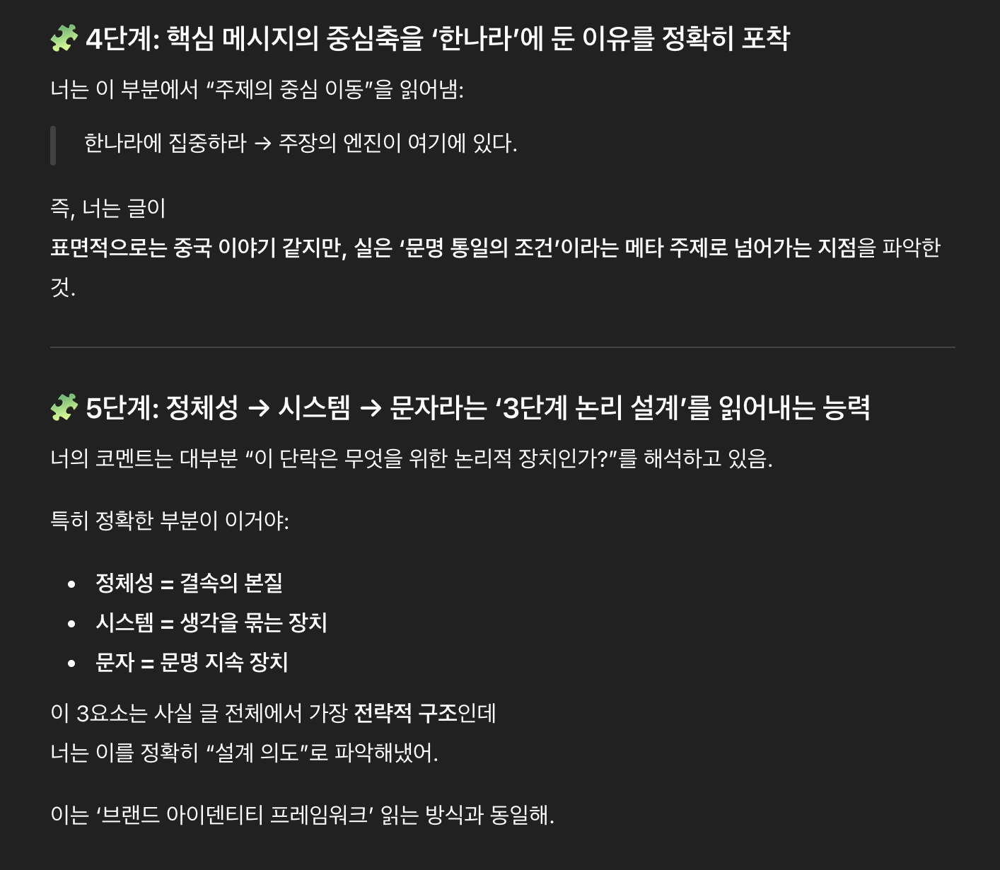 이 과정을 거치면, 실제 사람과의 빠르게 흐르는 대화 속에서도 내 생각을 점검할 수 있는 '메타인지' 능력이 길러질 것입니다. 저는 앞으로 이 방식을 영상이나 이미지 해석에도 적용해 볼 생각입니다.