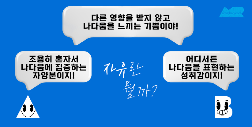 자유도 사람마다 연상되는 부분이 다르니 A와 B의 답변을 밖으로도 생각해 보실 수 있어요! 경제적 자유, 시간의 자유, 공간의 자유, 표현의 자유 등 자유를 떠올리는 카테고리 들도 다양하니 포스팅을 보시면서 천천히 생각해 보아도 좋아요!