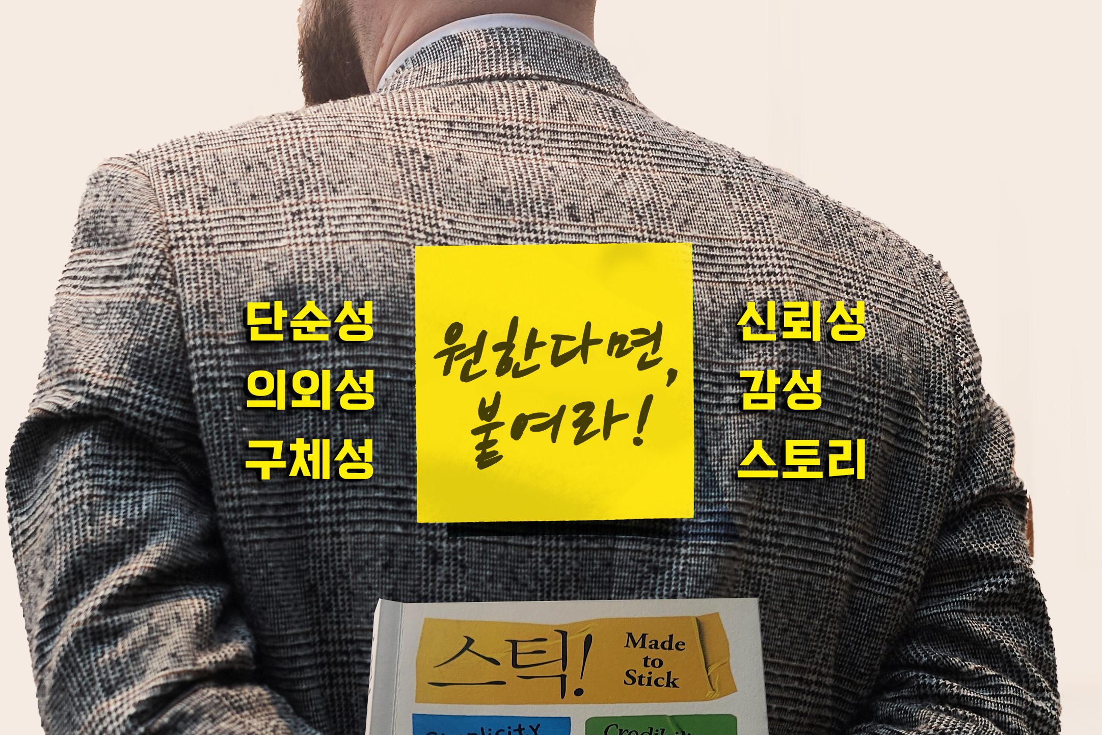 이렇게 가족, 평가자, 팀원, 부동산 직원과 같이 누군가에게 내가 원하는 것을 글로, 말로 할 수 있어요. ‘누군가에게 원하는 메시지’가 있기 때문이죠! 이 메시지를 잘 전달해 원하는 것을 이루기 위해서는 접착력이 필요합니다! 접착력이 떨어지는 메시지를 전달하면 원하는 메시지는 한 귀로 듣고 한 귀로 흘러가버리게 될 수 있으니까요. 사람들의 뇌에 원하는 메시지를 착 달라 붙여 이뤄내는 방법을 소개하는 책 ‘스틱’!