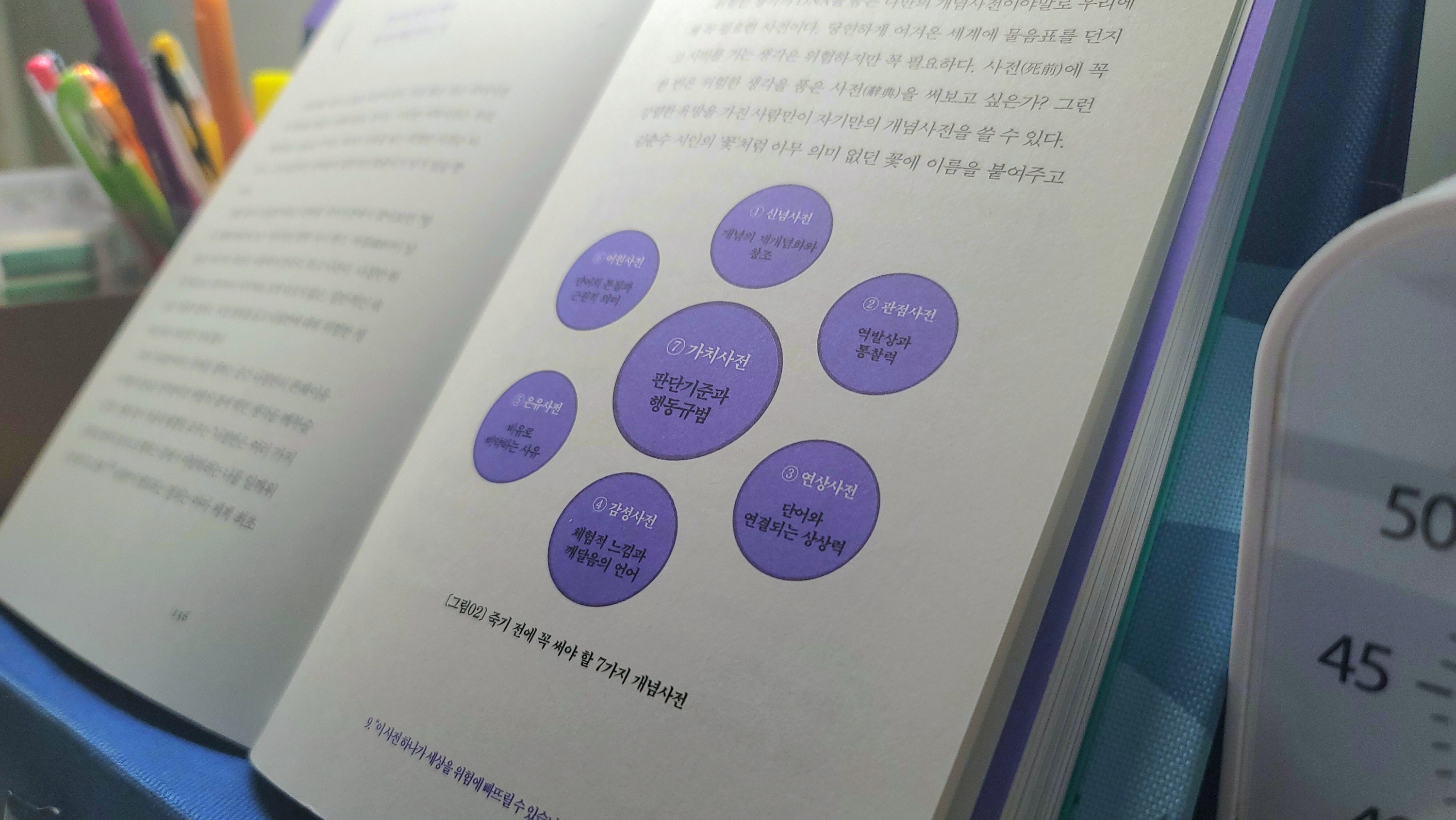 책에서는 바른 태도와 생각, 예쁜 말씨를 말하기보다 자신만의 사전인 7가지 개념사전을 제시합니다. 사람은 하나의 책이나 영상을 보더라도 저마다 다른 생각과 울림이 있기에 같은 단어에도 개념과 관점, 연상되는 이미지, 감정 등이 모두 다르기에 이를 정리하고 개발시켜 나가는 디자인 설계 법으로 언어(단어)에 대한 자신만의 사전 만들기에 대해 알려줍니다. 저는 이 사전을 통해서 정체성의 큰 뿌리인 개인의 가치 체계와 철학 체계들을 관리하고 온전하게 자신의 정체성을 적절히 표현하는 것에 있어 사전 역할을 할 것이라 생각합니다.